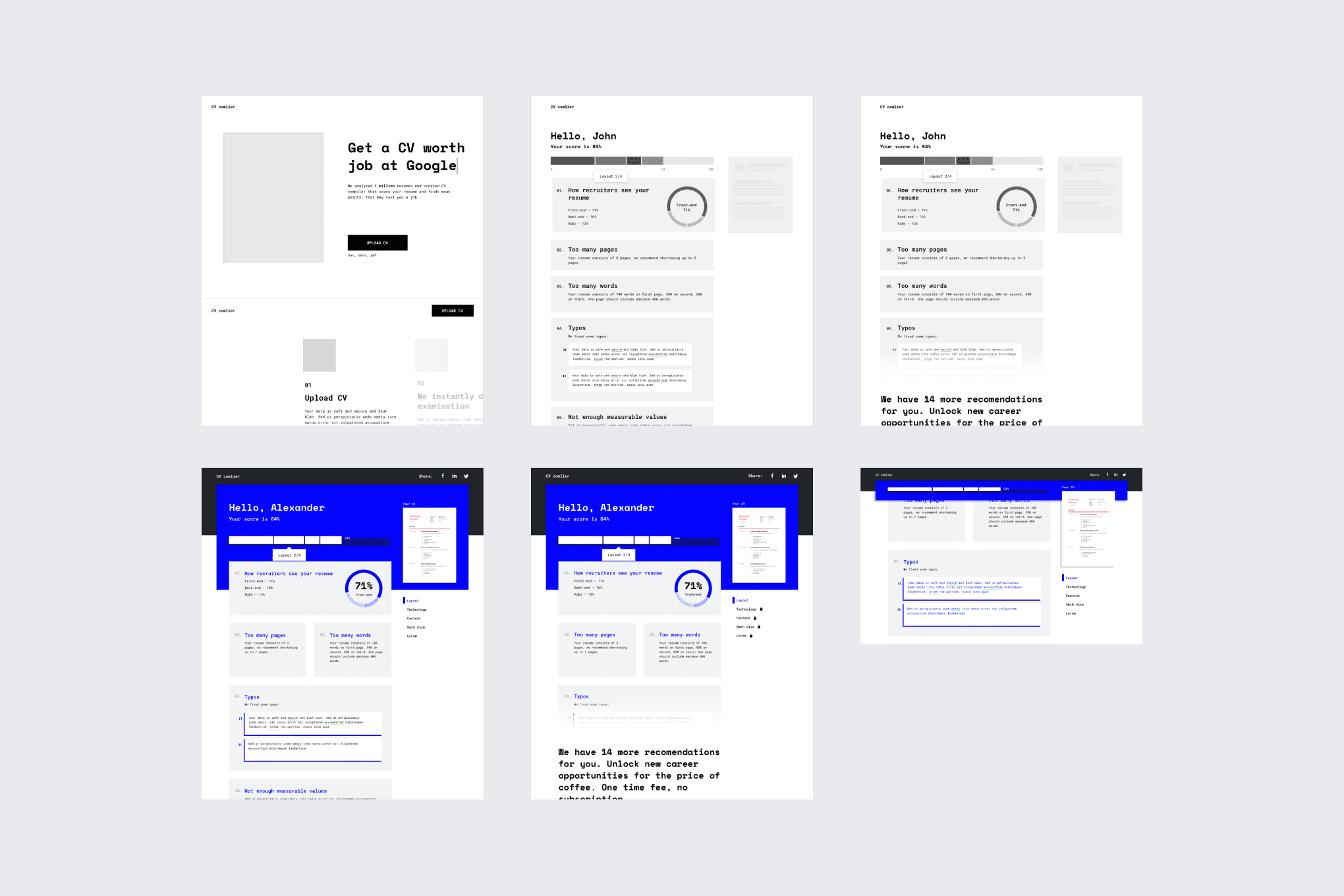 The landing page is built around simple, minimalistic sections that still create a strong visual impact thanks to thoughtful styling, illustrations, and transition animations. Each section delivers a clear, straightforward message that builds user trust, while social proof reinforces that trust even further. The narrative flows naturally toward the primary call to action – uploading a résumé.